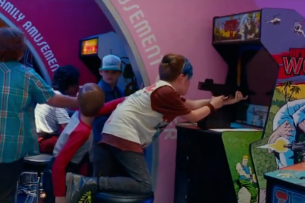 Si te fijas en el niño que sostiene una pistola, el nombre que aparece en la parte superior de la máquina es el de Operation Wolf. Sin embargo, ese juego no salió a la venta hasta 1987. Ocurre lo mismo con otra de las máquinas recreativas que aparecen en este espacio, la cual aparece con el nombre de Rampage, un juego que no vio la luz hasta 1986.
