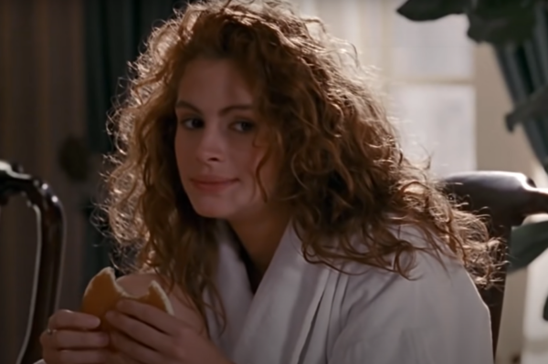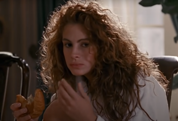 ¿Sabes a qué escena corresponde esta imagen? Es la secuencia en la que Edward y Vivian comparten un desayuno y empiezan a conocerse mejor, y en la imagen que puedes ver sobre estas líneas el personaje de Roberts está comiendo una tortita. Sin embargo, tan solo unos segundos antes Vivian aparece algo diferente.
