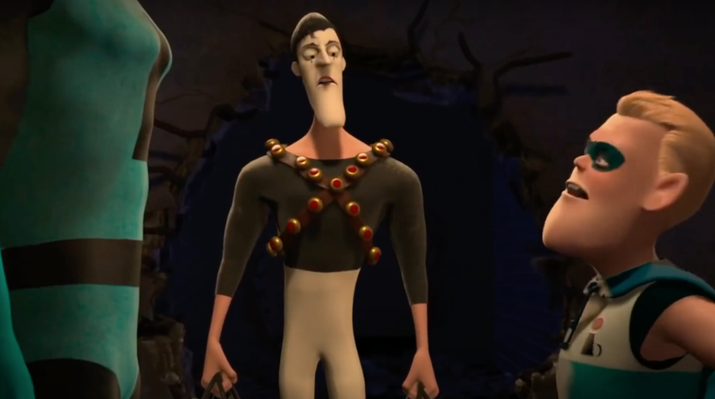En este frame aparecen en escena Mr. Increíble, Incrediboy y Boom Voyage, cuando este último acaba de robar una cámara acorazada y el protagonista le pilla con las manos en la masa. A continuación, aparece el pequeño Incrediboy, que más tarde se convertirá en el macabro némesis de Mr. Increíble.