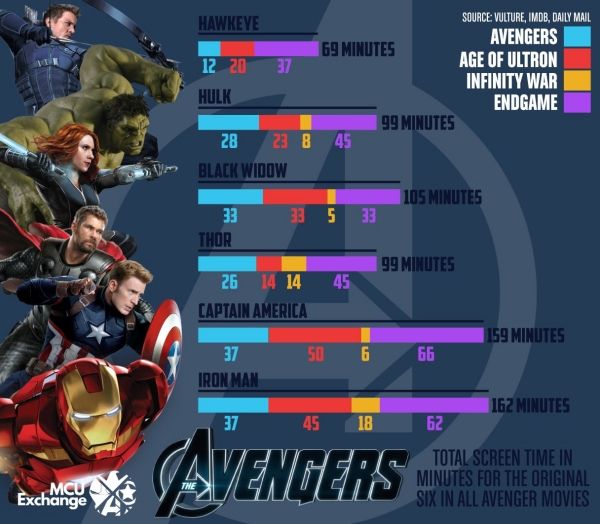 Pero el dilema siempre se centra en el protagonismo de los Vengadores originales. La infografía creada por el perfil de Twitter Marvel Exchange ha compartido una imagen en la que mediante una gráfica podemos ver con detalle la presencia en pantalla de Iron Man, Thor, Capitán América, Viuda Negra, Ojo de Halcón y Hulk en el UCM.