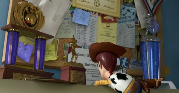 Si te fijas, esta imagen esconde mucho más de lo que puedes ver más allá de Woody trepando por una mesa hasta llegar al corcho de Andy donde se encuentran todos los trofeos que ha ido acumulando a lo largo de los años. Si miras a la zona izquierda de tablón encontrarás una postal puesta con una chincheta azul, al lado de un post it del mismo color. ¿La has identificad?