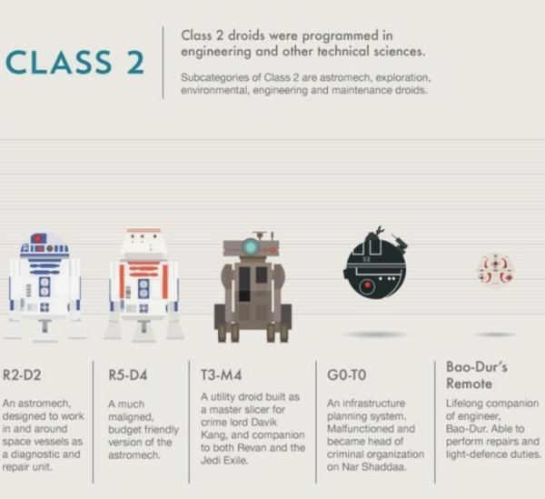 El pequeño e inseparable amigo blanco y azul de metal que acompaña a los protagonistas en todas las cintas de Star Wars, R2-D2, pertenece a la clase 2. Esta infografía lo define como: "Un astromecánico, diseñado para trabajar en y alrededor de las naves espaciales como unidad de diagnóstico y reparación". Sin embargo, este androide llevó una misión mucho más personal y dedicada a los humanos que su función inicial, como todos sabemos.