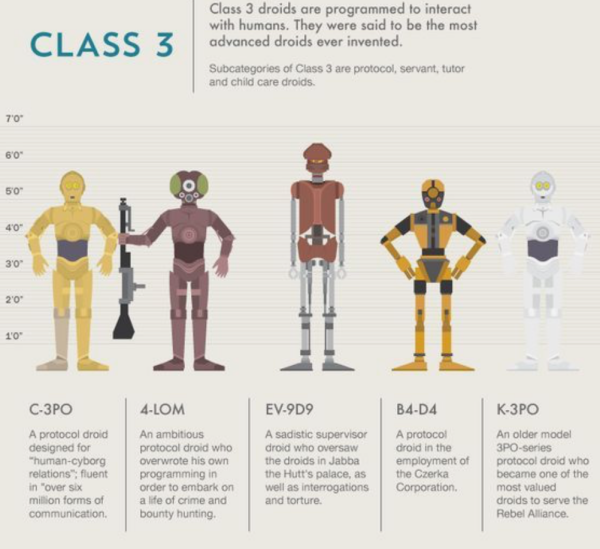 En cambio, su fiel compañero de aventuras, C3-PO, el cual vimos sus primeros pasos con la segunda trilogía estrenada en cines, pertenece a la clase 3, aquella en la que se engloban todos los androides creados para interactuar con los humanos. Además, de estos grupos, la infografía original, puedes verla en su tamaño al completo aquí, añade otras dos clases más.