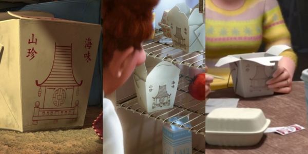 Esta caja de comida china ha acompañado a los personajes de Toy Story 2, Ratatouille y Del revés (Inside Out). Todas y cada una de ellas tienen el mismo dibujo, por lo que podemos decir que los protagonistas de estas cintas, incluida Bichos y Los Increíbles, han pedido comida asiática para llevar al mismo restaurante.