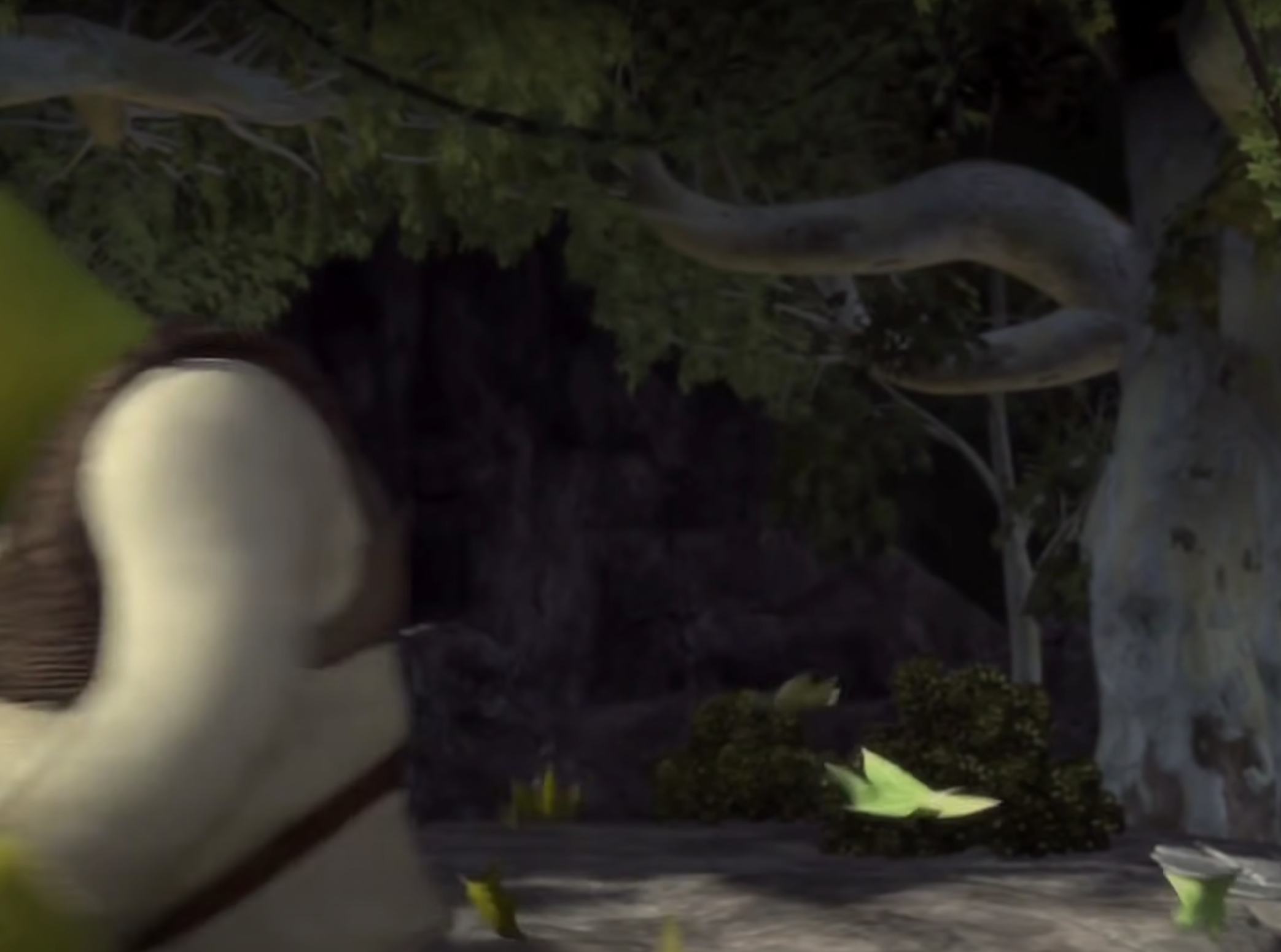 El gazapo se esconde en la escena que tiene lugar después de la secuencia que protagoniza Fiona, quien se enfrenta a los hombres del bosque y acaba victoriosa. En medio de esta pelea, por el contrario, Asno y Shrek se quedan paralizados ante el momento y las destrezas de lucha de su compañera de viaje.