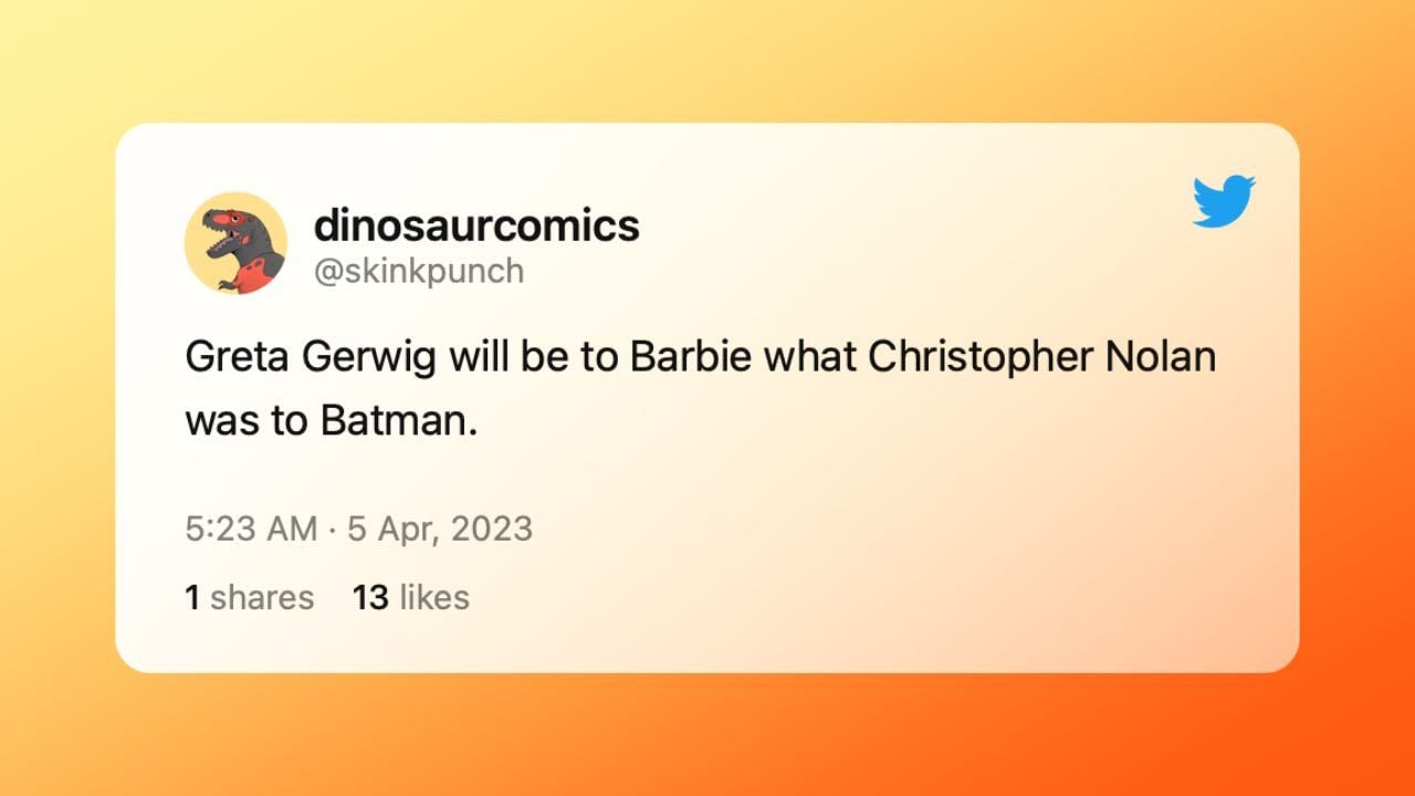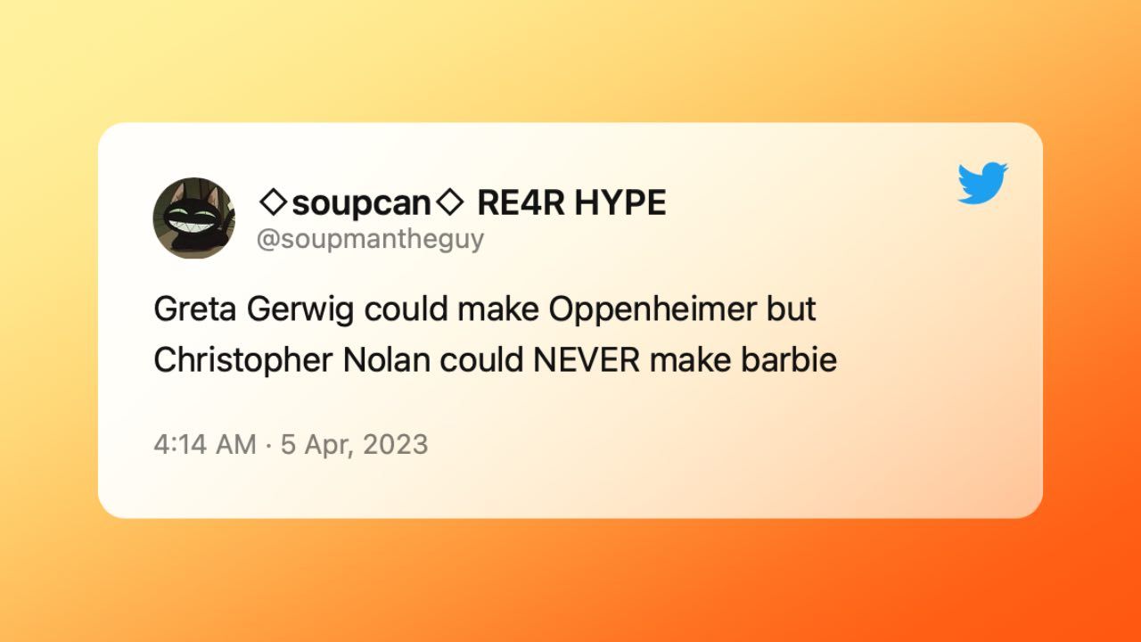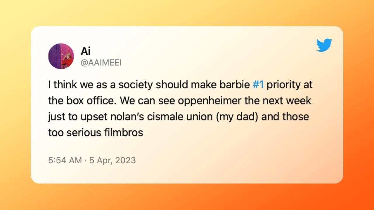 "Creo que, como sociedad, deberíamos hacer que Barbie sea la prioridad número uno de la taquilla. Podemos ver Oppenheimer la siguiente semana solo para molestar a la unión cismasculina de Nolan (mi padre) y esos bros cinéfilos serios".