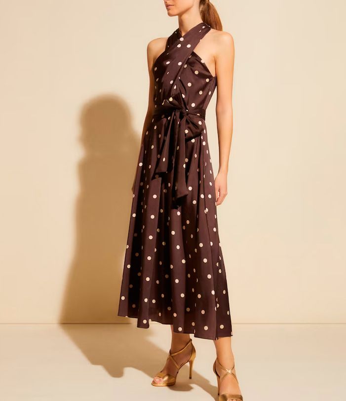 La prenda pertenece a la colección de fiesta de El Corte Inglés y se trata de vestido midi fluído con cuello halter y, por supuesto, color marrón chocolate con lunares blancos. Además, como el que lucía Roberts en la película, también tiene cinturón.