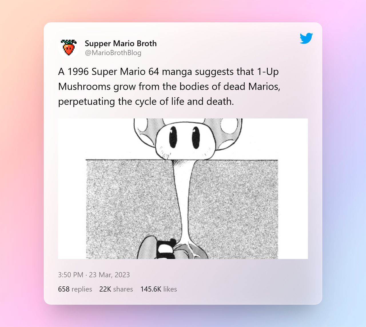 Nacida en 1996 entre las páginas de un manga que revisitaba Super Mario 64 de forma poco convencional, dicha teoría se interesa por las famosas setas 1-UP de forma bastante inquietante, tal y como demuestra la imagen compartida recientemente en la cuenta de Twitter de Supper Mario Broth.
