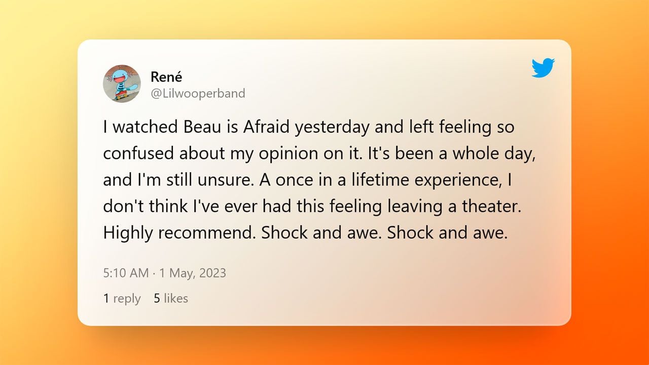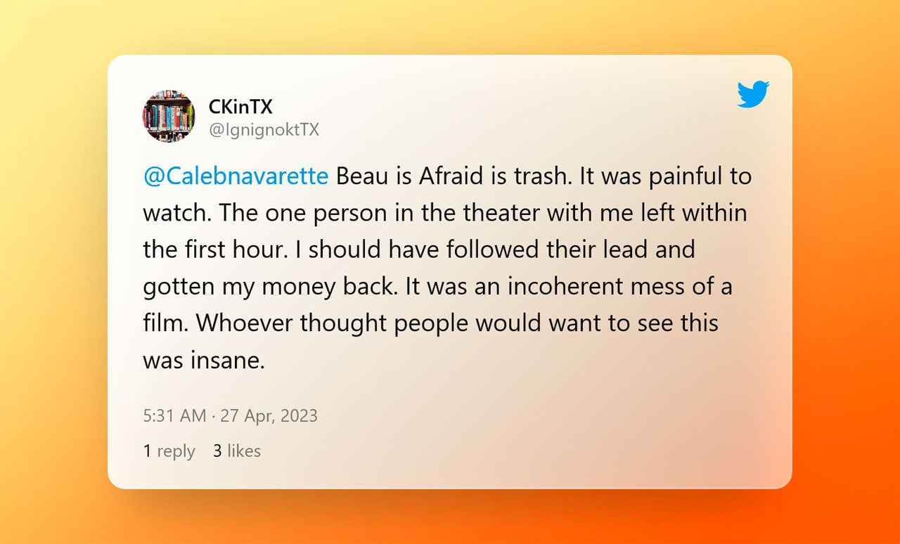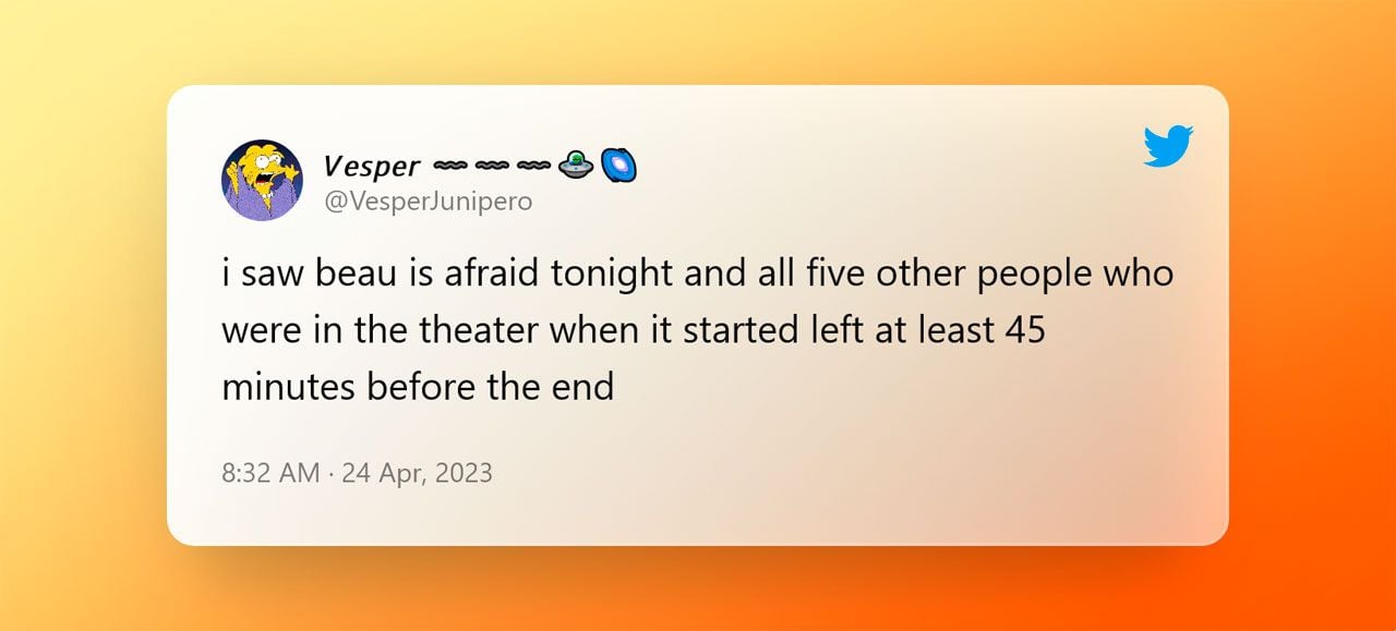 Que Beau tiene miedo está provocando que algunas personas se marchen de la sala sin terminar de ver una película es una realidad: "La única persona que estaba conmigo en el cine se fue en la primera hora. Debería haber seguido su ejemplo y recuperar mi dinero"; "He visto 'Beau tiene miedo' esta noche y las otras cinco personas que estaban en el cine cuando comenzó se fueron al menos 45 minutos antes del final", "Había como 4 personas más en el teatro y para la segunda hora la mitad de ellos ya se habían ido"; "El chico que estaba a mi lado se fue en los últimos 20 minutos y nunca más volvió"; o "Creo que nunca había experimentado un suspiro de decepción tan colectivo y compartido hasta ahora" son solo algunos de los comentarios que pueden encontrarse en Twitter sobre la experiencia de la gente con la película.
