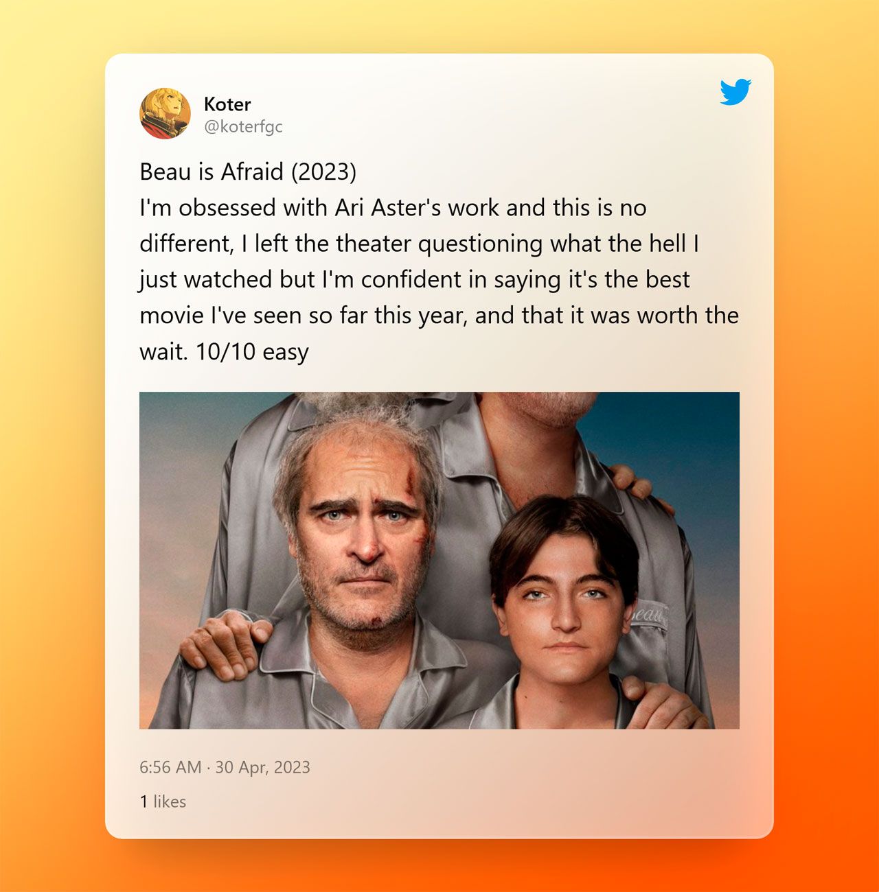 Pero entre las opiniones, que sin duda están de lo más polarizadas, también es muy fácil encontrar elogios. Algunos señalando incluso que "es de lejos la mejor película que han visto este año". De hecho, Beau tiene miedo ostenta un nada despreciable 70% de valoraciones positivas por parte de la prensa especializada en Rotten Tomatoes, mientras que un 71% de los espectadores también le dedica elogios.