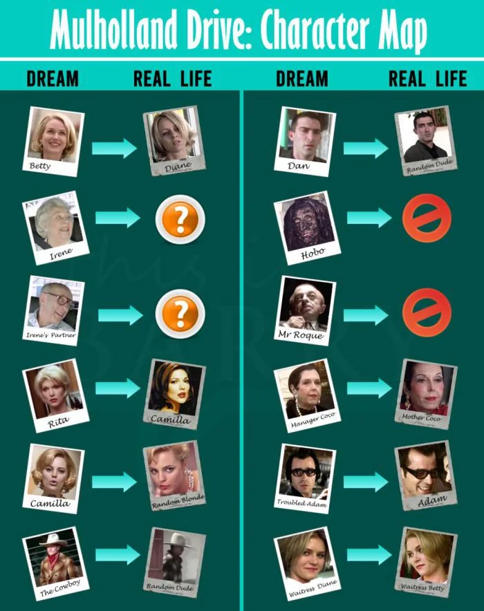 Es muy probable que estés absolutamente confundido sobre quién es quién en Mulholland Drive, y para explicar durante horas mi teoría (es absolutamente imposible ser objetivo con esta cinta, no hay una verdad absoluta) ya puedo acompañarme, por suerte, de este gráfico en el que adivinaremos quién es quién en el sueño y en la realidad. Como guía para empezar la película, desde luego, no está mal.