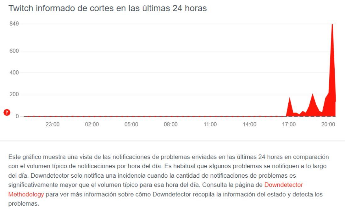 Esta gráfica muestra el registro de caídas del servicio en las últimas 24 horas. A simple vista se aprecia un importante crecimiento en el número de incidencias a lo largo de esta tarde, coincidiendo con los platos fuertes de La Velada. Te advertimos, si quieres disfrutar del evento de Ibai Llanos, ten mucha paciencia.