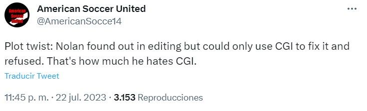 En internet, el error causó bastante debate entre algunos fanáticos y muchos memes. Sobre todo, mucha gente se imagina cómo reaccionará Christopher Nolan cuando se entere del anacronismo que acaba de meter en su última película. "Giro de guion: Nolan se dio cuenta en la sala de edición pero solo podía arreglarlo con CGI y lo rechazó. Esto es lo mucho que odia el CGI", dice un usuario.