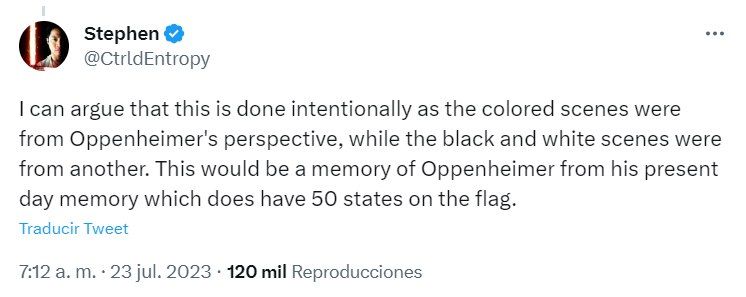 "Puedo argumentar que esto se hizo intencionalmente, ya que las escenas en color son desde la perspectiva de Oppenheimer, mientras que las escenas en blanco y negro son desde la parte de Lewis Strauss. Este sería un recuerdo de Oppenheimer desde su recuerdo actual, cuando la bandera tiene 50 estados", intenta defender un fan.