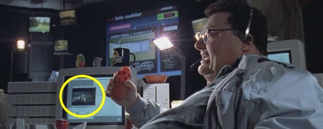 Es curioso que en una pantalla de al lado podamos ver un detalle perfecto que pasa desapercibido: en el minuto 54:18, si nos fijamos en la pantalla donde se está llamando con el polideportivo de Isla Nublar... realmente es un vídeo en el que Nedry ha apretado el botón "Play". Ay, Spielberg, viejo zorro. Si es que no hay como ser un mago del cine para ocultarnos cosas a plena vista.