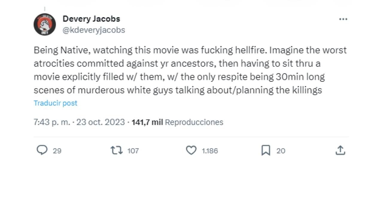 Como continúa: "Puedo entender que la dirección técnica de Martin Scorsese es convincente y ver 200 millones de dólares en pantalla es un espectáculo digno de contemplar. Entiendo que el objetivo de esta violencia es añadir un 'shock' brutal que obligue a la gente a comprender los horrores reales que le sucedieron a esta comunidad, pero no creo que a estas personas tan reales se les mostrara honor o dignidad en la horrible descripción de sus muertes. Por el contrario, creo que mostrar más mujeres nativas asesinadas en pantalla normaliza la violencia cometida contra nosotros y deshumaniza todavía más a nuestro pueblo (y para colmo, ¿la forma en la que los nerds del cine celebran y se comente esta mierda? Me dan náuseas)".