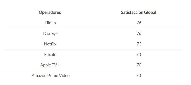 Las siguen muy de cerca Netflix, con un 73 de satisfacción, y, después, Flixolé, Apple TV+ y Prime Video con un 70 todas ellas.