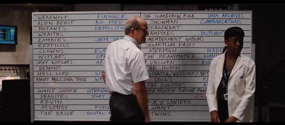 Y dentro de estas referencias hay una que es absolutamente directa e hilarante: cuando están pensando qué monstruos enviar, en la pizarra hay escritas un montón de sugerencias, desde un hombre lobo hasta una bestia alienígena. Si te fijas bien, verás que hay dos guiños a Posesión infernal: el Árbol Abusador Gigante (No olvidemos que en la cinta de 1981, un árbol gigante ataca y abusa de una mujer) y los Deadites. Por si la propia idea de una cabaña perdida en el bosque no fuese lo bastante reminiscente de la obra de Sam Raimi.