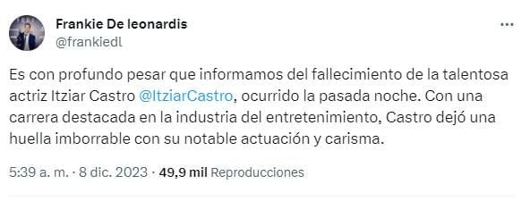 "Es con profundo pesar que informamos del fallecimiento de la talentosa actriz Itziar Castro, ocurrido la pasada noche. Con una carrera destacada en la industria del entretenimiento, Castro dejó una huella imborrable con su notable actuación y carisma", escribe De Leonardis, "Itziar no solo fue una actriz y artista talentosa, sino una incansable luchadora por sus ideales y creencias. Enfrentó cada desafío con una determinación y un coraje que inspiraron a muchos".