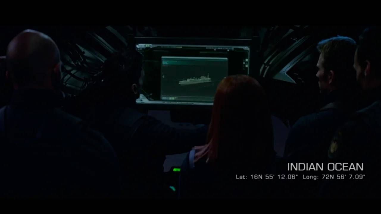 En la escena en cuestión, perteneciente a los primeros minutos de la película, Natasha Romanoff (Johansson) ha recogido a Steve Rogers (Evans) para reclutarlo para una misión. En la imagen, Natasha y Rogers aparecen junto al equipo S.T.R.I.K.E., donde se les explica la misión de liberar a los rehenes a bordo de un barco de S.H.I.E.L.D. que ha sido secuestrado por un grupo de piratas franceses.