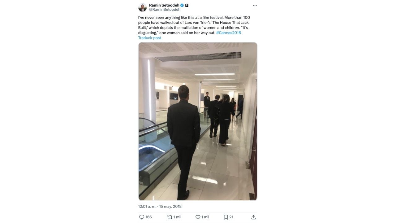 Una de las espectadoras que abandonó la sala publicó: "Me acabo de marchar de la premier de Lars von Trier en Cannes 2018 porque ver a niños siendo disparados y asesinados no es arte ni entrentenimiento".
