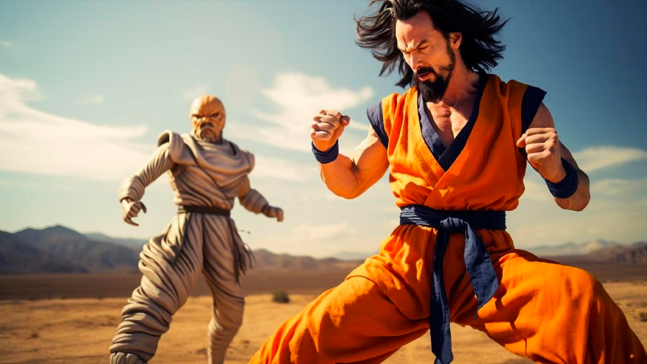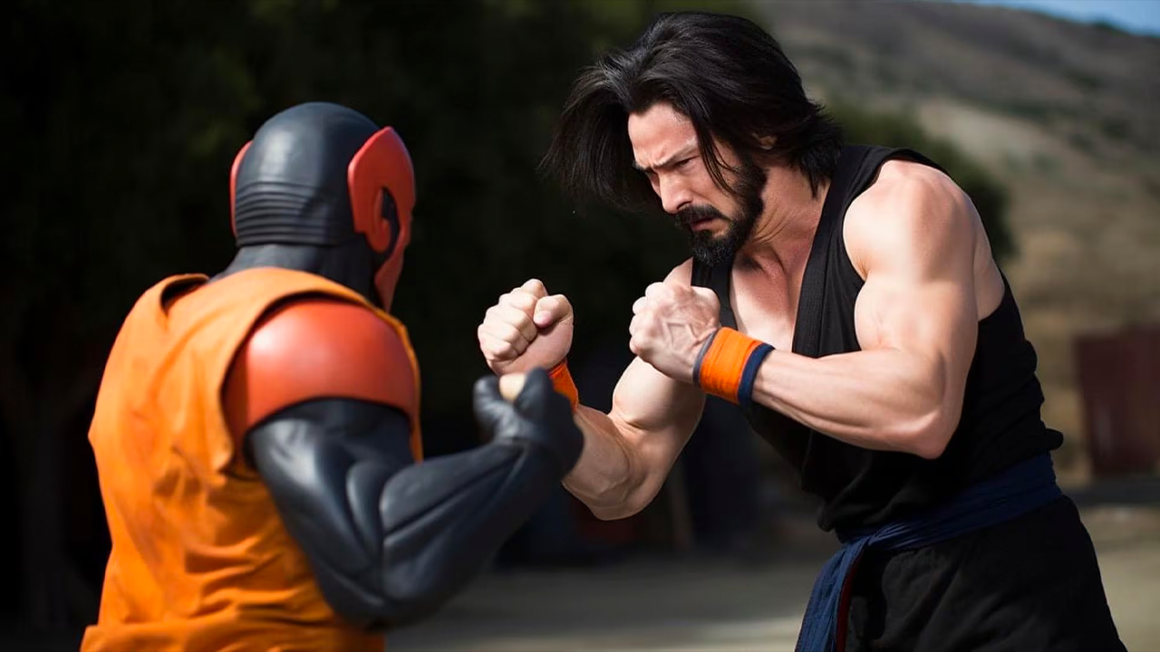 El que no está en ninguna quiniela para ser Son Goku es Keanu Reeves, pero eso no ha impedido que MidJourney imagine cómo sería una posible lucha entre él disfrazado de Goku y Freezer, si es que os apetece echar un vistazo al lado más extraño de la vida. Otra posibilidad es que lo imaginéis, porque el cerebro humano siempre va a ser muchísimo más artístico que una máquina. Pero bueno, si no os apetece hacer el proceso, pues he aquí.