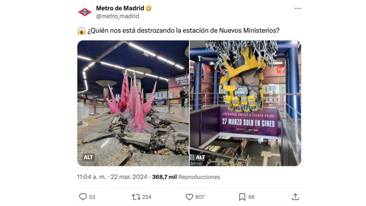 "Me encanta el marketing de guerrilla", dice la usuaria de Twitter esther_trilogy, que ha compartido imágenes de la experiencia. "¿Quién nos está destrozando la estación de Nuevos Ministerios?", se pregunta la cuena oficial de Metro de Madrid. "Impresionante", comenta AliencitoB.