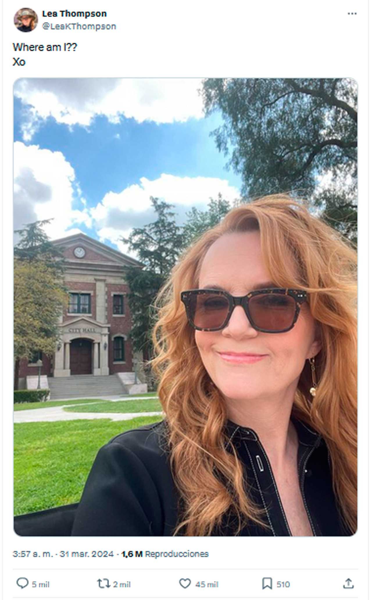 "¿Dónde estoy?", escribe la actriz en su cuenta de X -antes Twitter- junto a un selfie en el que aparece frente al icónico ayuntamiento de Hill Valley y su aún más icónico reloj.