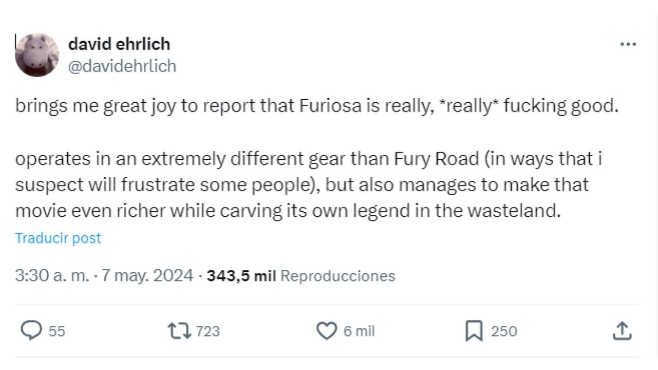 La película de acción postapocalíptica que lleva 15 años en desarrollo pero llega ahora a los cines, 9 años después de la última de la saga"Me da mucha felicidad informar de que Furiosa es jodidamente buena", comienza David Ehrlich en Twitter. "Opera en un engranaje extremadamente diferente al de Furia en la carretera (en formas que sospecho frustrarán a algunas personas), pero también logra hacer que la película sea más rica mientras labra su propia leyenda en el páramo".