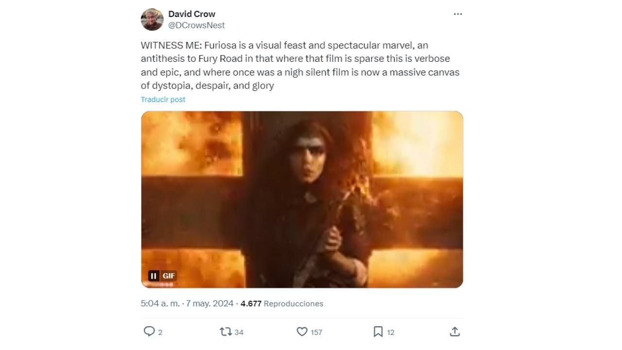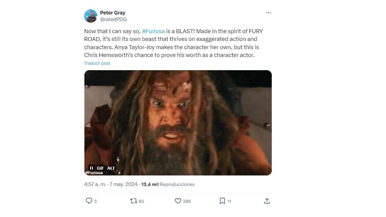 "Ahora que puedo decirlo: ¡Furiosa es la leche! Hecha en el espíritu de Furia en la carretera, sigue siendo su propia bestia que se nutre de acciones y personajes exagerados. Anya Taylor-Joy hace suyo el personaje, pero esta es la oportunidad de Chris Hemsworth de demostrar su valía como actor", reacciona Peter Gray.