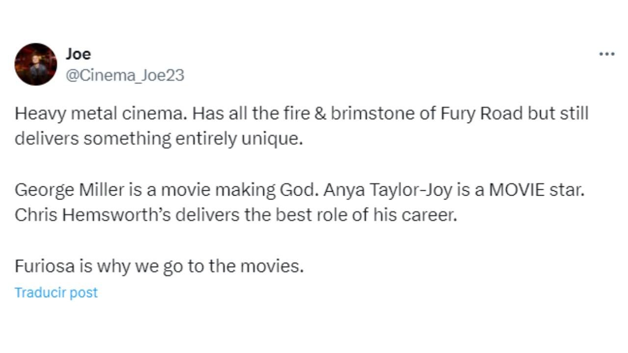 "Cine heavy metal. Tiene todo el fuego y el azufre de Furia en la carretera pero todavía ofrece algo que la hace completamente única. George Miller es Dios cineasta. Anya Taylor-Joy es una estrella de cine. Chris Hemsworth ofrece el mejor papel de su carrera. Furiosa es la razón por la que vamos al cine", señala Joe.