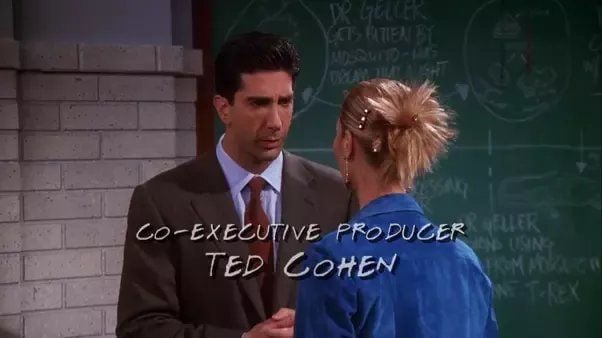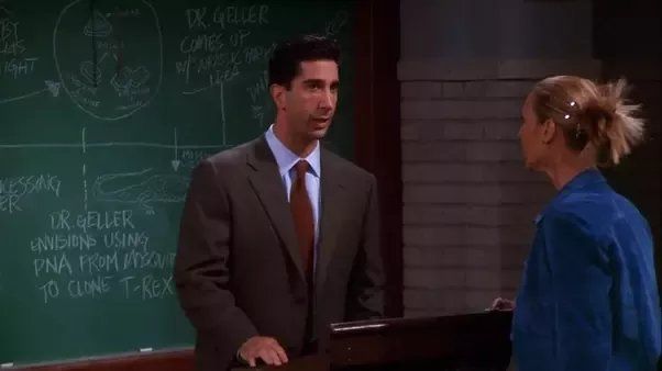 Y los guionistas decidieron que no se quedara solo en una broma tirada al aire: durante toda la escena podemos ver en la pizarra cómo Ross ha explicado exactamente cómo llegó a esa idea antes que Michael Crichton: "Al Dr. Geller le pica un mosquito - tiene un sueño esa noche"; "El Dr. Geller visualiza usar ADN del mosquito para clonar un T-Rex" y una línea de tiempo en la que podemos ver dibujos de la secuencia del ADN y de un dinosaurio. Un detalle maravilloso para los ojos más rápidos.