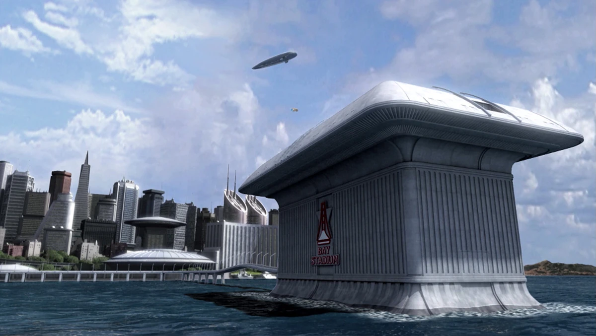 Vámonos durante un segundo a 2004, porque en el tercer episodio de la cuarta temporada de Star Trek Enterprise, titulado El hogar, un episodio pivotal en la serie que trata de mostrar cómo el equipo vuelve a la sociedad después de la lucha contra los Xindi en la temporada 3. Y, entre otros lugares, podemos ver el Bay Stadium, situado en San Francisco. Más o menos, donde están los muelles ahora mismo, pero en el siglo XXII. Un detallito, ¿no?