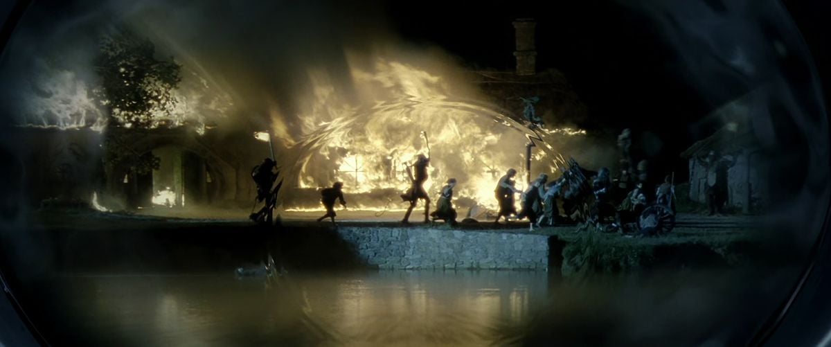 No fue el único trozo que se quitaron de encima, aunque este ejemplo sí que podría haber sido más grave: en La comunidad del anillo leemos cómo Hobbiton queda esclavizado por completo por las huestes de Sauron. Aunque Jackson sintió que irnos tan lejos de la historia por un momento no ayudaría al ritmo de la película, sí necesitaba incluirlo de alguna manera, así que lo hizo, tal cual como lo describía Tolkien, en el momento en que Frodo mira dentro del espejo de Galadriel.