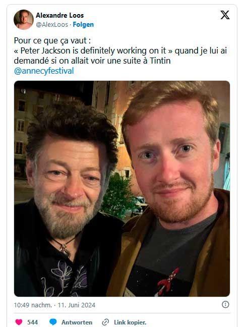 Hablando con Alexandre Loos en el marco del Annecy International Animation Film Festival, tal y como el propio periodista francés ha revelado en su cuenta de X (antes Twitter), Andy Serkis habría confirmado que Peter Jackson "definitivamente está trabajando" en una secuela de Las aventuras de Tintín: El secreto del unicornio, la película de aventuras que Steven Spielberg dirigió en 2011 y en la que el actor participó interpretando al Capitán Haddock.