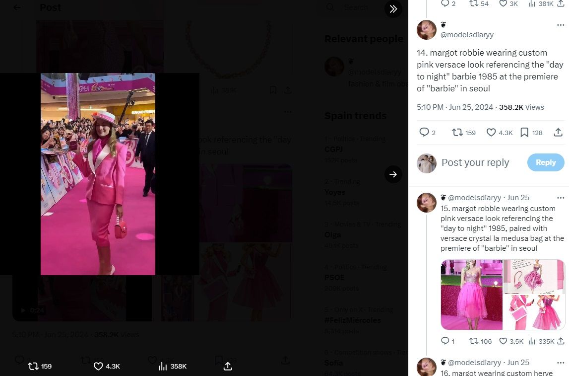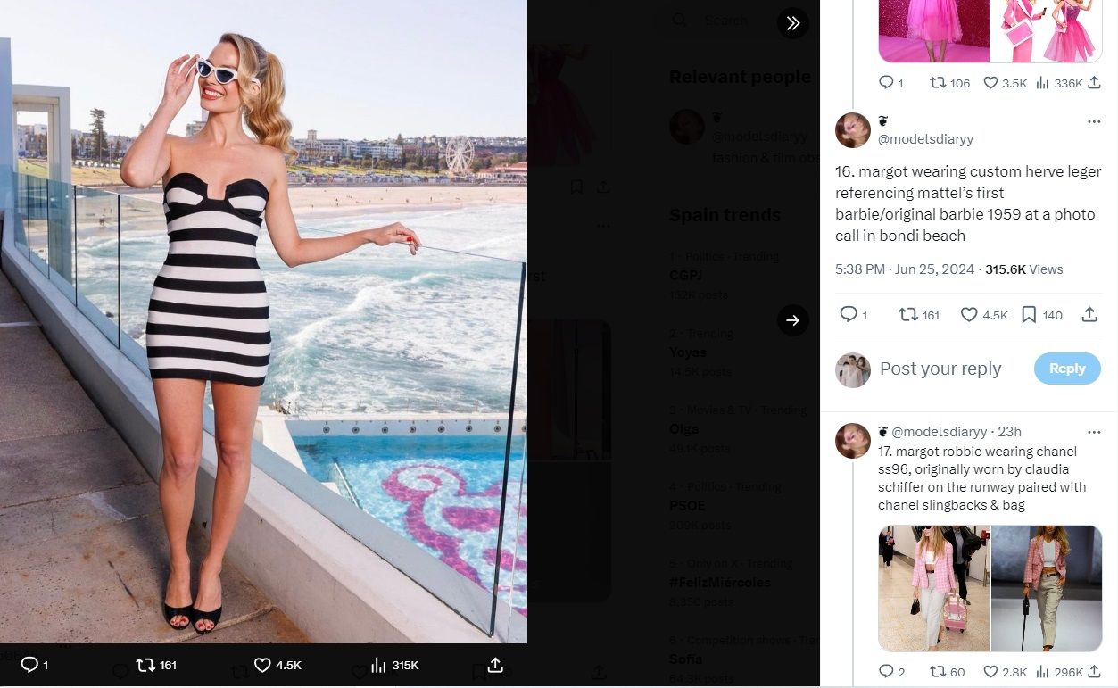 Podría decir que este "look" fue mi favorito de todos los eventos que giraron en torno a la promoción de Barbie, pero es que hay tales maravillas que me cuesta la vida elaborar un ranking. Sin embargo, he de admitir que esta propuesta guarda un lugar especial en mi corazón, ya que es una referencia a la primera muñeca Barbie de Mattel y el minivestido que lució Robbie es un diseño de Hervé Leger, una firma que me trae buenísimos recuerdos de mi adolescencia, cuando estaba descubriendo más a fondo mis referencias de moda, ya que todas las "celebrities" llevaban los famosos vestidos de "bandage" de esta casa.