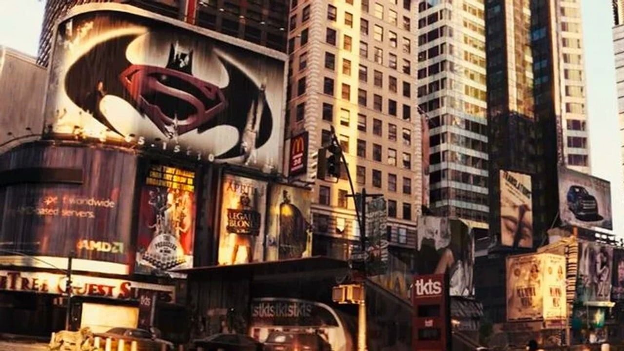 Al parar la imagen verás el famoso tablero de Times Square de Nueva York con el anuncio de los superhéroes. No habla de la película como tal, pero ver los dos logos superpuestos ya indica que Clark Kent y Bruce Wayne se iban a ver las caras en pantalla grande antes de que llegara el fin de la humanidad.