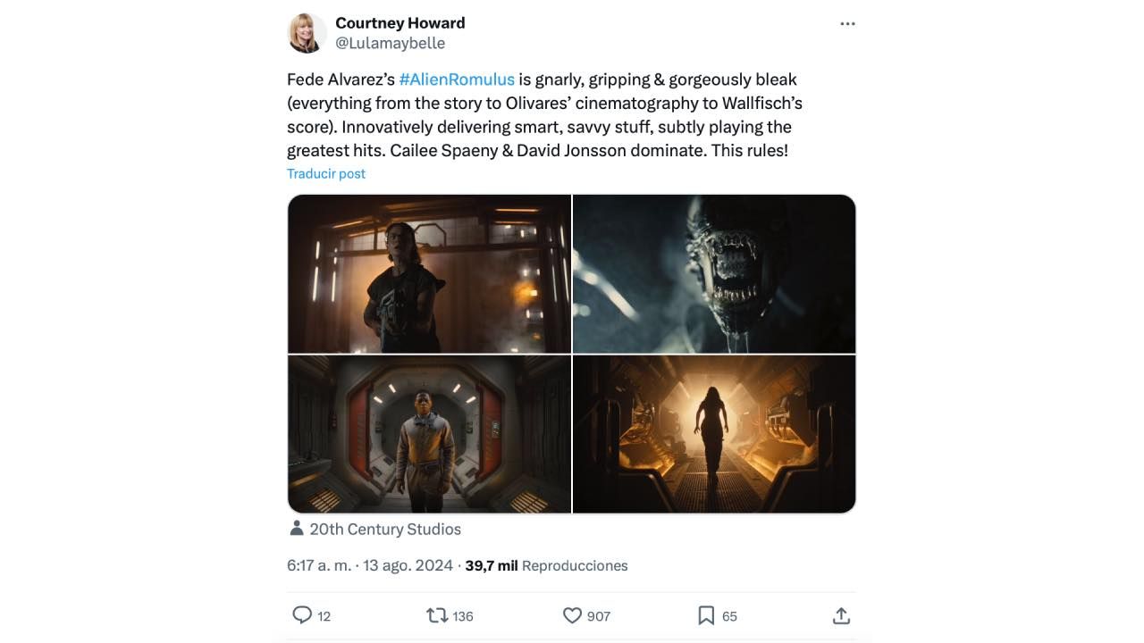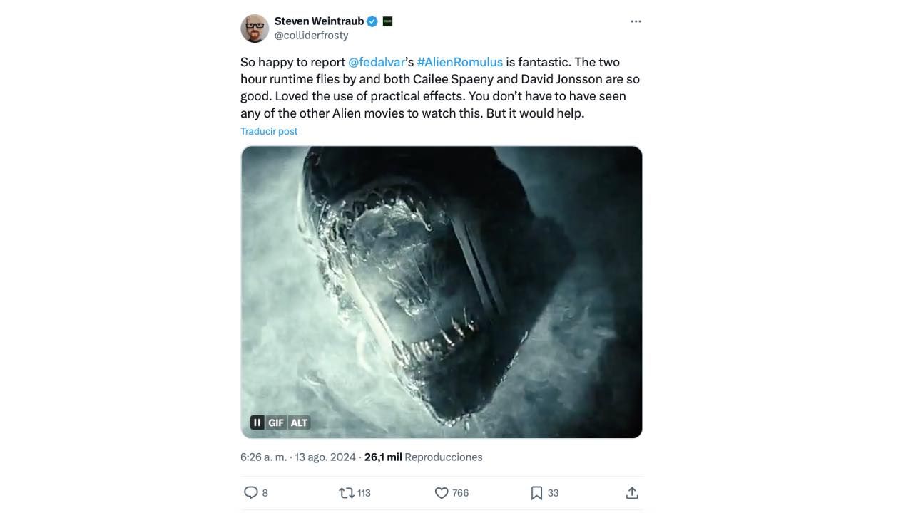 "Feliz de informar que Alien: Romulus de Fede Álvarez es fantástica. Las dos horas de duración pasan volando y tanto Caile Spaeny como David Jonsson son muy buenos. Me encantó el uso de efectos prácticos. No es necesario haber visto ninguna de las otras películas de Alien para ver esta, pero ayuda", señala Steven Weintraub.