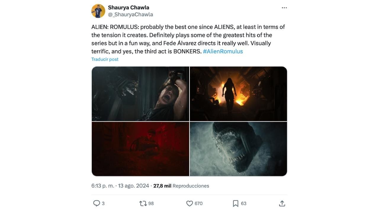 "Probablemente, la mejor desde Aliens, al menos en términos de la tensión que crea. Definitivamente, incluye algunos de los mejores momentos de la saga pero de forma divertida y Fede Álvarez dirige muy bien. Visualmente increíble y sí, el tercer acto es una locura", afirma Shaurya Chawla.
