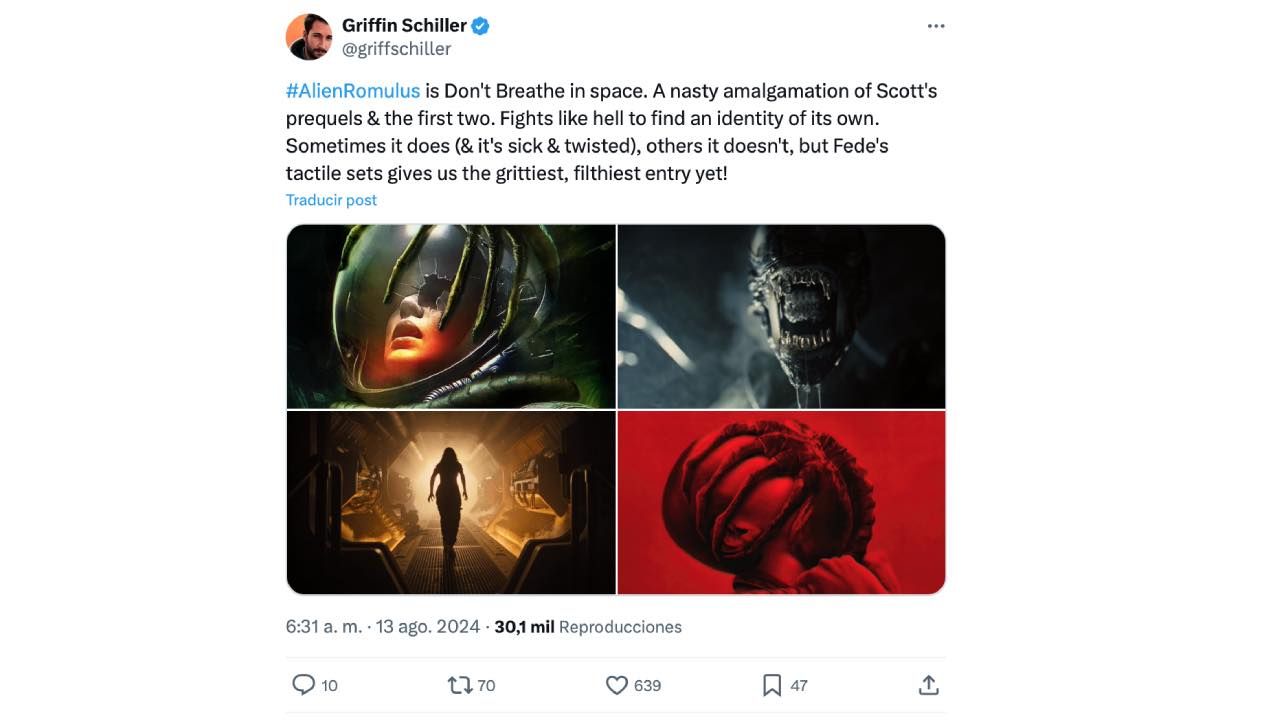 "Alien: Romulus es No respira en el espacio. Una desagradable fusión de las precuelas de Scott y las dos primeras. Lucha por encontrar una identidad propia. A veces lo hace (y es enfermizo y retorcido), otras no, ¡pero Fede nos brinda la entrada más valiente y sucia hasta ahora!", publica Griffin Schiller.