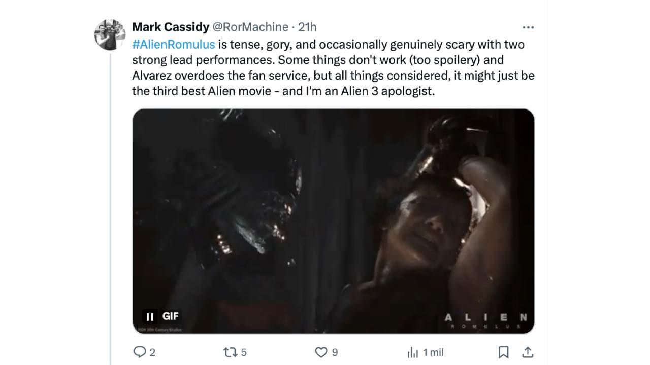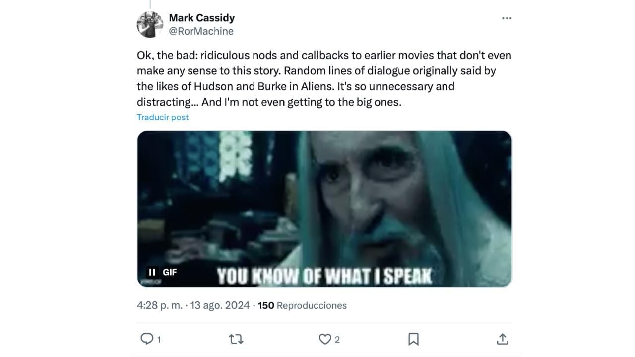 "Alien: Romulus es tensa, gore y, ocasionalmente, genuinamente aterradora con dos interpretaciones protagonistas fuertes. A veces no funciona (demasiados 'spoilers') y Álvarez exagera el 'fan service', pero considerando todo, podría ser la tercera mejor película de Alien y soy un apologista de Alien 3", indica Mark Cassidy. "Vale, lo malo: conexiones y referencias ridículas a las primeras películas que no tienen sentido en la historia. Frases de diálogo aleatorias dichas por Hudson y Bruke en Aliens. Es tan innecesario y distrae… Ni siquiera voy a llegar a las importantes".