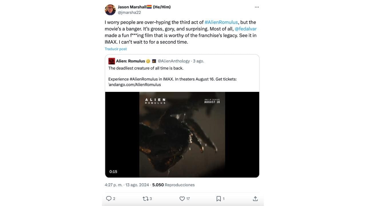"Me preocupa que la gente tenga muchas expectativas por el tercer actor de Alien: Romulus, pero la película es genial. Es asquerosa, gore y sorprendente. Sobre todo, Fede Álvarez ha hecho una jodida película que merece mantener el legado de la franquicia. Vedla en IMAX. No puedo esperar a hacerlo una segunda vez", comparte Jason Marshall.