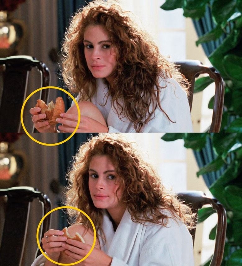 Después de un cambio de plano, Vivian ya no tiene un cruasán en la mano, sino una tortita. Pero la magia aún no ha terminado. la protagonista vuelve a morder la tortita, a la que ya le falta una esquina. Sin embargo, tras los siguientes cortes (primero en Richard Gere, luego de nuevo en ella), se produce el siguiente milagro: la tortita vuelve a tener el mismo aspecto, es decir, el último trozo mordido ha vuelto.