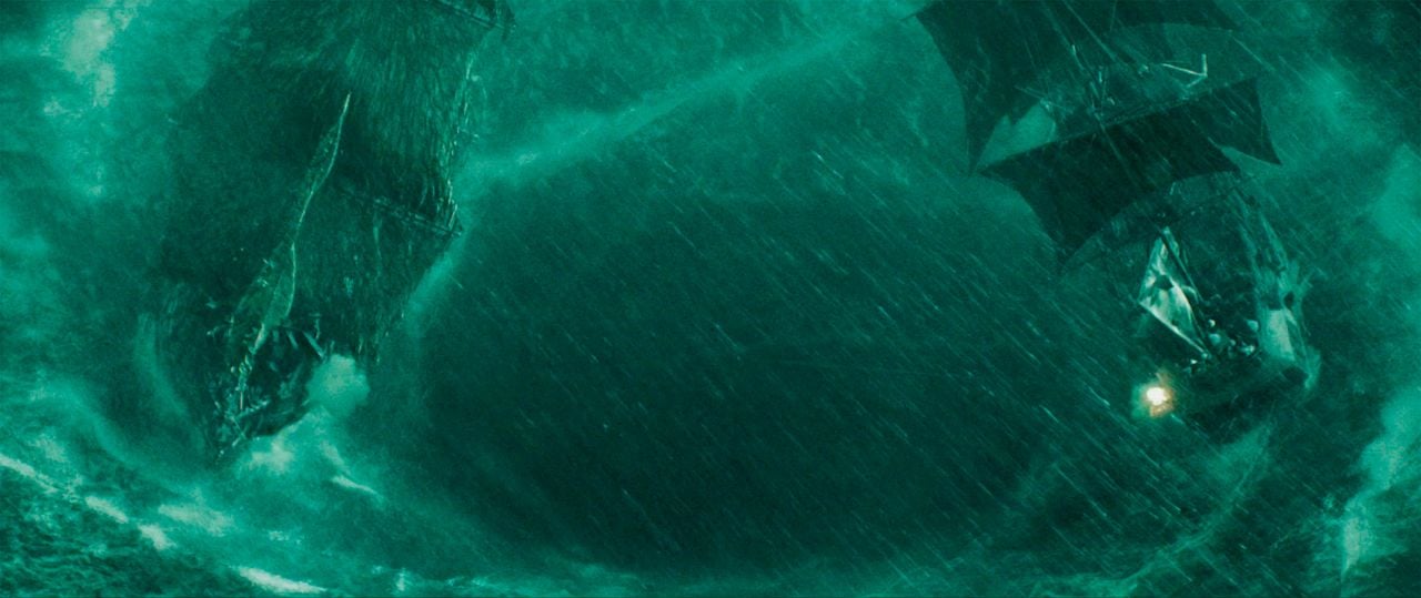 En el actor final de Piratas del Caribe 3, dos veleros, el Perla Negra y el Holandés Errante, se enfrentan en duelo para decidir el destino de la piratería, el mundo libre y nuestros queridos personajes. Esta batalla se desarrolla dentro de un vórtice colosal, o como lo definió Geoffrey Rush, “algo como el remolino bíblico del infierno”.