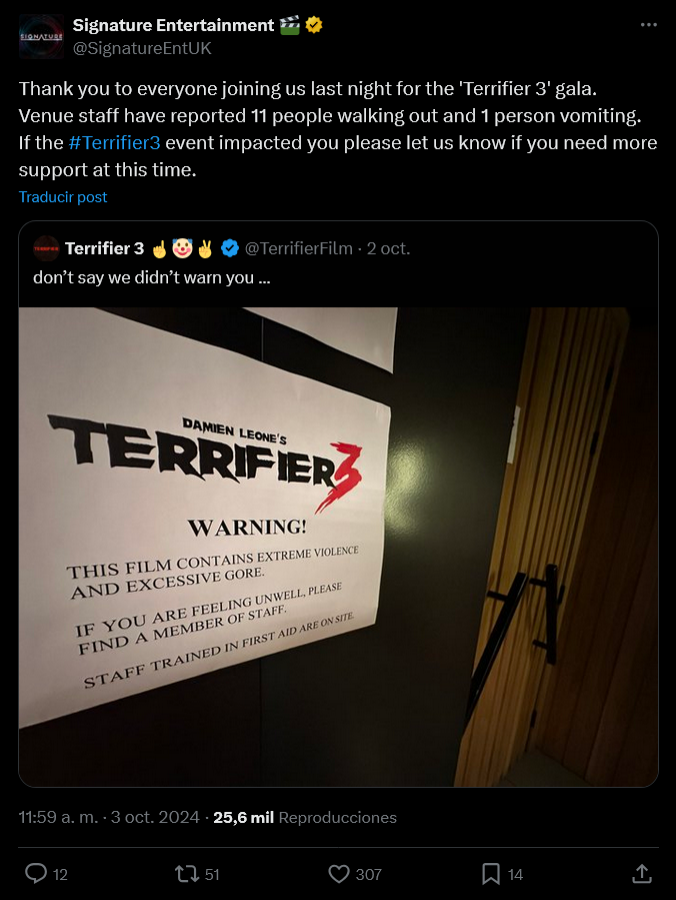 "Si el evento Terrifier 3 te ha afectó, avísanos si necesitas más ayuda en este momento", afirmaba la compañía en redes sociales al tiempo que compartía el propio cartel de la sala en el que se informaba a los espectadores de que podían pedir ayuda al personal si se sentían enfermos. "Esta película contiene extrema violencia y gore extremo. Si te sientes mal, por favor busca a algún trabajador. Nuestros trabajadores están formados en primeros auxilios y se encuentran en el local", reza el cartel.