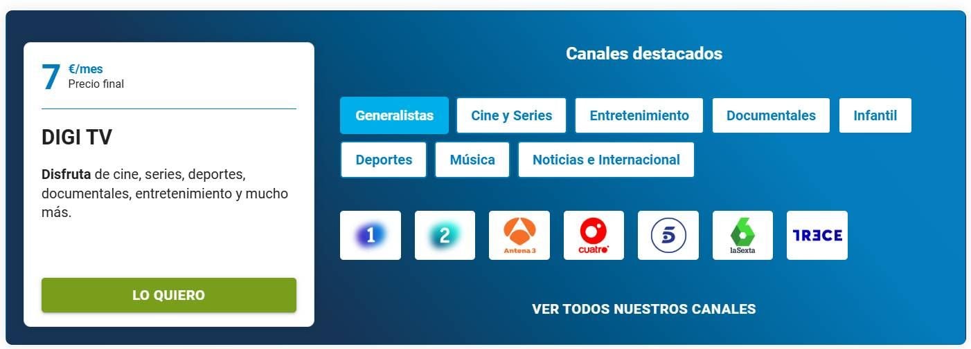 Finalmente ha llegado el momento esperado. Llevábamos mucho tiempo esperando a que Digi se atreviera a dar el paso después de su lanzamiento en Portugal y, por fin, su servicio de televisión está disponible en España. Tal como se anticipaba, ofrece una variada selección de canales que incluyen generalistas, cine, series, deportes, documentales, entretenimiento, entre otros.