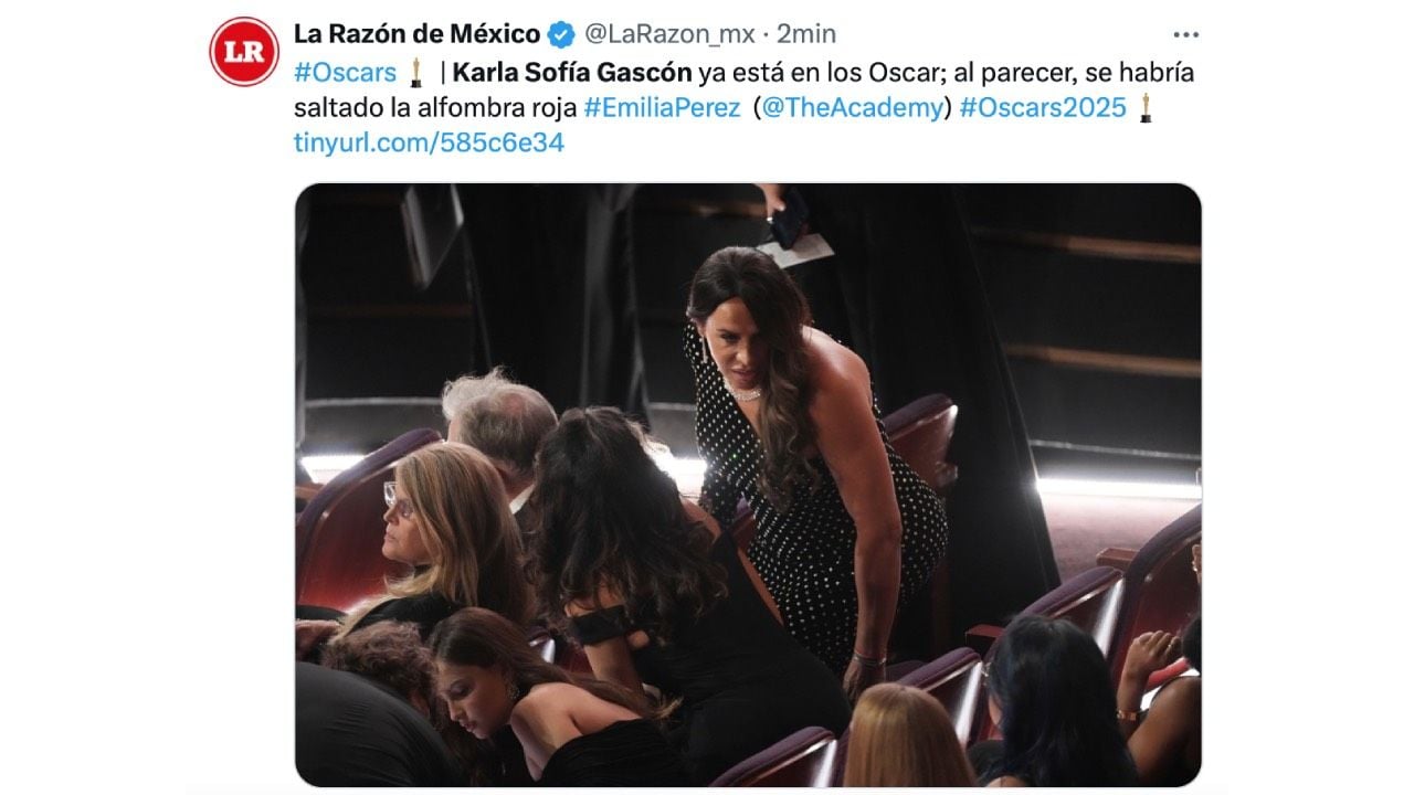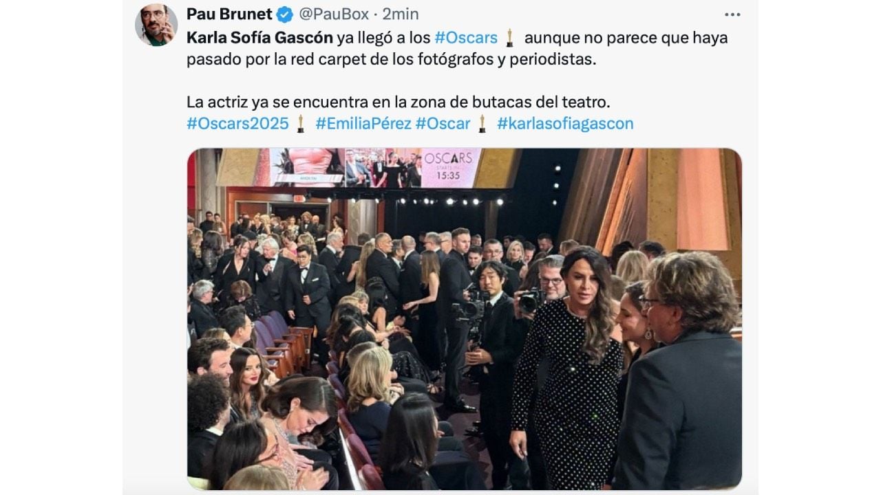 Las primeras imágenes de Gascón en los Oscar 2025 han aparecido en X. En ellas se ve a la actriz dentro del Teatro Dolby de Los Ángeles. No se la ha visto en la alfombra roja, a diferencia de sus compañeras de reparto Selena Gomez y Zoe Saldaña, que sí la han pisado.