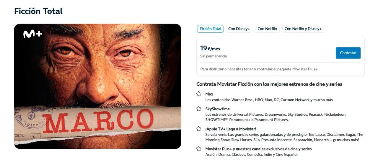 Se trata del pack de cine y series que han bautizado Ficción total y que incluye cuatro suscripciones: Max, SkyShowtime, Apple TV+ y la propia Movistar Plus+, claro, con acceso a sus canales exclusivos de cine y series. El precio: 19 euros.