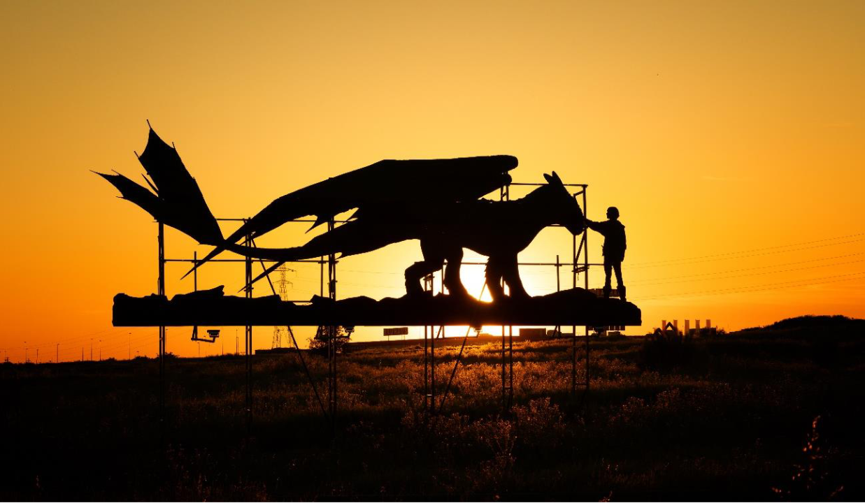 La silueta, que recorta el horizonte mostrando el tierno momento en que el protagonista acaricia al dragón por primera vez, está compuesta por 40 chapas metálicas negras y cuenta con un diseño que bien podría asemejarse a las de nuestro símbolo nacional por antonomasia, el toro de Osborne. La instalación tiene unas dimensiones de 12 metros de largo por 6 de alto y puede verse desde la carretera en dirección salida de Madrid. Cuenta, además, con propia iluminación que añade más espectacularidad si cabe a la escena.