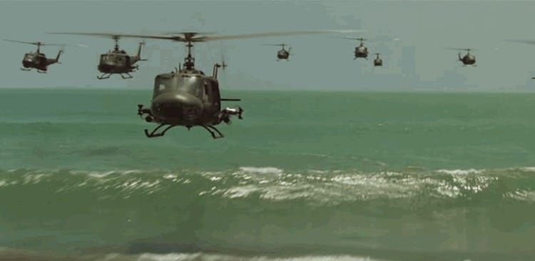 Curiosamente, algunas de las escenas más bellas de la película (al ritmo de La cabalgata de las Valquirias) casi no pudieron hacerse, porque los helicópteros que salen realmente eran propiedad del gobierno de Filipinas, que en aquel momento los estaba utilizando para luchar contra los insurgentes. ¿Qué hacía el equipo de la película? Todos los días los pintaban para la película y después los repintaban para que el ejército pudiera utilizarlos por la noche.